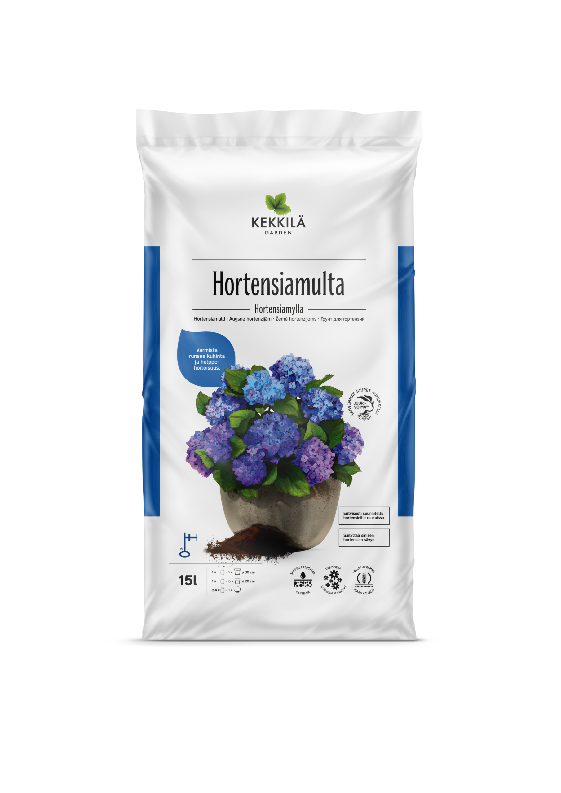Spetsiaalselt potis kasvatatavatele hortensiatele mõeldud erimuld. Hortensiamulda on lubjatud ja väetatud viisil, mis säilitab sinise hortensia kauni värvuse. Hortensiamuld sobib ka pinnasesse istutatavatele hortensiatele ja potis kasvatatavatele okastaimedele. Mulla struktuur on püsiv ja õhuline tänu hoolikalt valitud toorainete kasutamisele. Mulla sisse segatud sammal toimib veelaona ja hõlbustab kastmist. Hortensiamulda on lisatud huumuseühendit Kekkilä Juurejõud™, mis toetab taimede juurdumist ja toitainete omastamist.